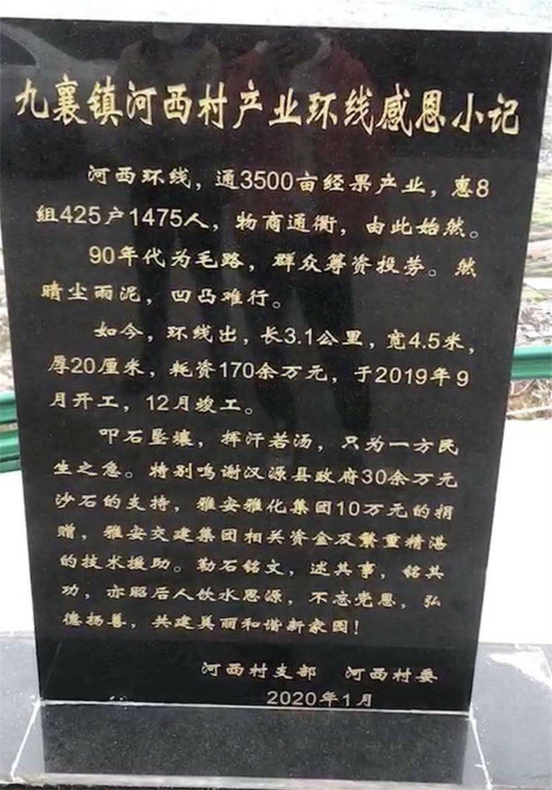 近期,漢源縣九襄鎮(zhèn)河西村勒石銘文,撰寫“九襄鎮(zhèn)河西村產業(yè)環(huán)線感恩小記”,以紀念該村水泥環(huán)線公路竣工通車。