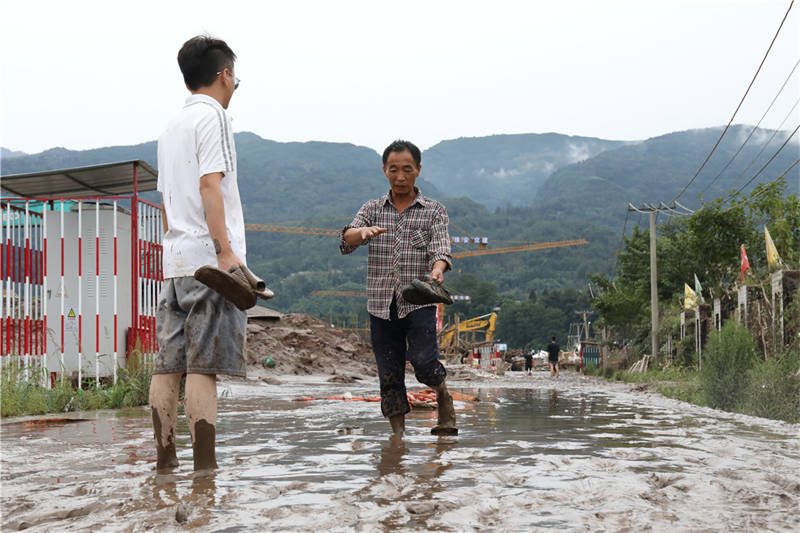 8月18日下午,在草壩青衣江大橋建設(shè)現(xiàn)場,項目部外的院壩、工地附近的道路,均覆蓋著厚厚的淤泥!白蛲砭o急撤離,我的車停在河邊,也沒來得及開走,現(xiàn)在都沒找到!币荒樒v的李勁松告訴記者,雖然洪水漲勢迅猛,但他們撤離之前,提前通知了電力部門斷電,否則若有人再次靠近洪水,將面臨觸電的風險。