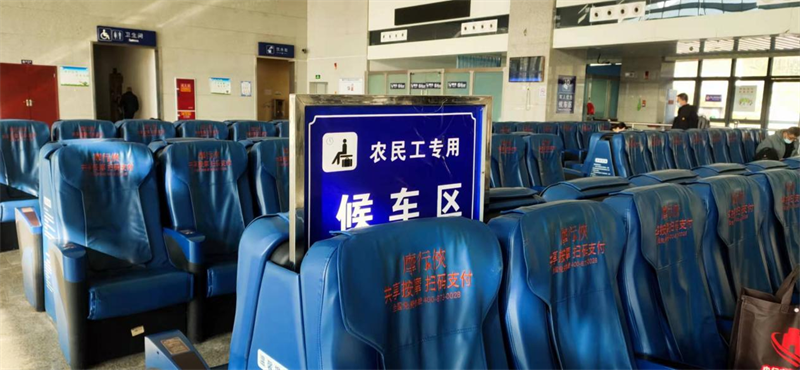 三是設置專門候車區(qū)。專設農(nóng)民工候車區(qū),配備軟座,方便農(nóng)民工朋友更好的候車休息,檢票口開通“刷臉驗票”及“人工通道”,安排工作人員引導農(nóng)民工朋友方便、快捷地乘坐客車。