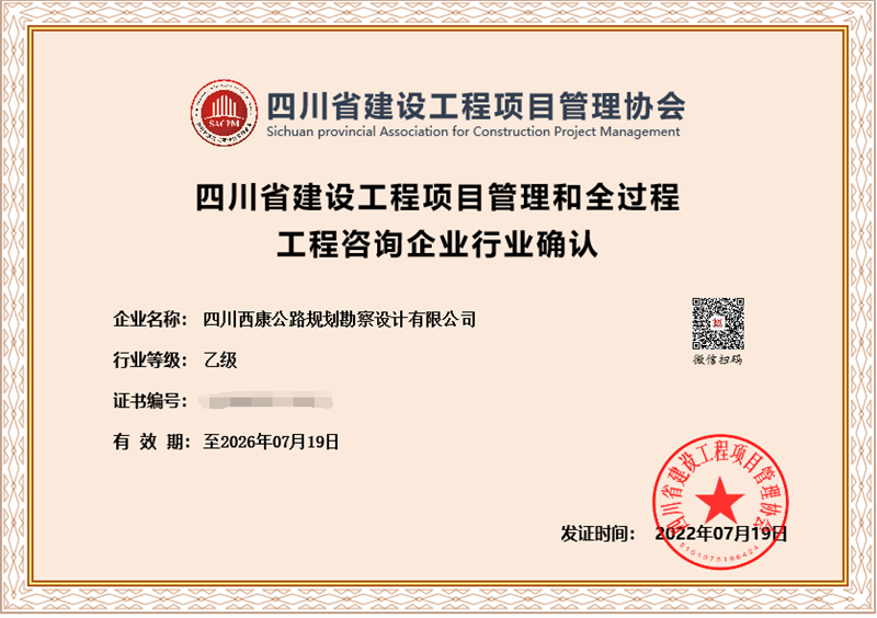 日前,經(jīng)四川省建設工程項目管理協(xié)會評審,交建集團四川西康公路規(guī)劃勘察設計有限公司獲得“四川省建設工程項目管理和全過程工程咨詢企業(yè)行業(yè)乙級資格”確認,成為四川省內為數(shù)不多獲得開展全過程項目管理和咨詢資質企業(yè)之一。