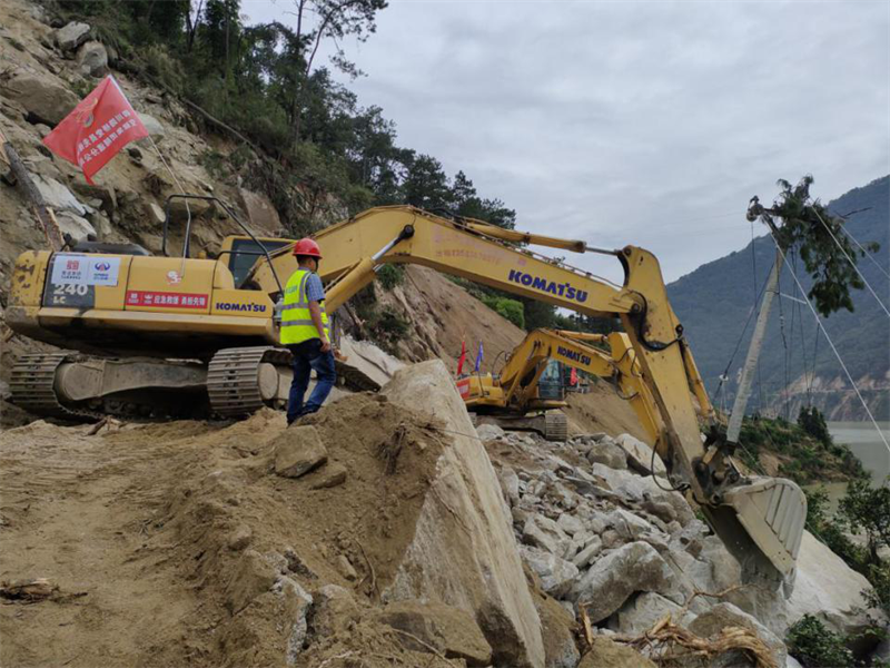 搶險(xiǎn)隊(duì)伍,馬上出發(fā)!集團(tuán)領(lǐng)導(dǎo)班子立即召開(kāi)碰頭會(huì),分析研判形勢(shì),安排部署工作,密切關(guān)注震區(qū)態(tài)勢(shì),成立抗震救災(zāi)領(lǐng)導(dǎo)小組,副總經(jīng)理鐘焱宇率現(xiàn)場(chǎng)指揮組趕赴石棉靠前指揮搶險(xiǎn)救災(zāi)。正在石棉G108線施工的康藏路橋公司項(xiàng)目部組成10人搶險(xiǎn)救援小分隊(duì),攜帶挖掘機(jī)4臺(tái)、拖車(chē)4臺(tái)、裝載機(jī)3臺(tái)、交通運(yùn)輸車(chē)2輛、無(wú)人機(jī)1臺(tái),第一時(shí)間到就地?fù)岆U(xiǎn)工作,震后7小時(shí),完成國(guó)道G108線馬富至菩薩崗約40公里路段、6處塌方點(diǎn)1600余方土石方清理,爾后轉(zhuǎn)戰(zhàn)石棉縣新民鄉(xiāng)進(jìn)行通鄉(xiāng)道路搶通作業(yè)。