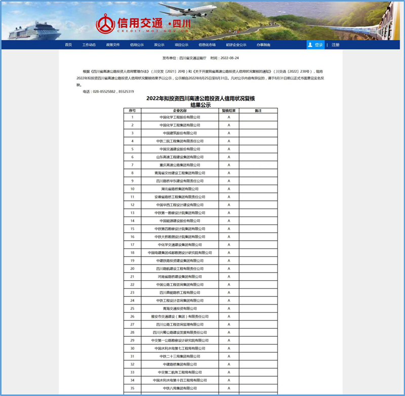 近日,四川省交通運(yùn)輸廳“信用交通(四川)”公示2022年擬投資四川省高速公路投資人信用狀況復(fù)核結(jié)果和2022年第3批擬投資四川省高速公路投資人初次信用評價(jià)結(jié)果,雅安市交通建設(shè)(集團(tuán))有限責(zé)任公司及下屬全資子公司四川康藏路橋有限責(zé)任公司獲得“A”級(jí)信用評價(jià)。