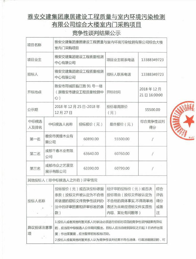 綜合大樓室內(nèi)門采購項目競爭性談判結(jié)果公示
