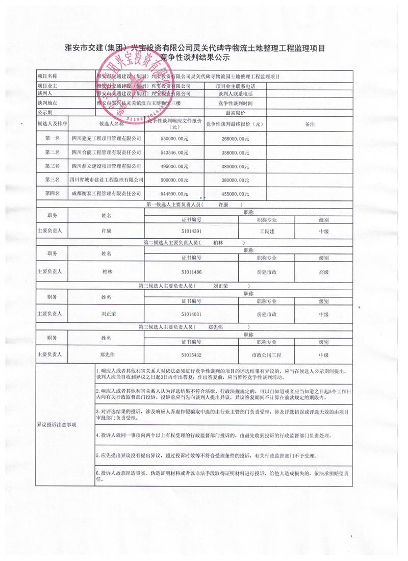 雅安交建集團(tuán)興寶投資有限公司寶興縣靈關(guān)代碑寺物流園土地整理工程監(jiān)理項目競爭性談判結(jié)果公示