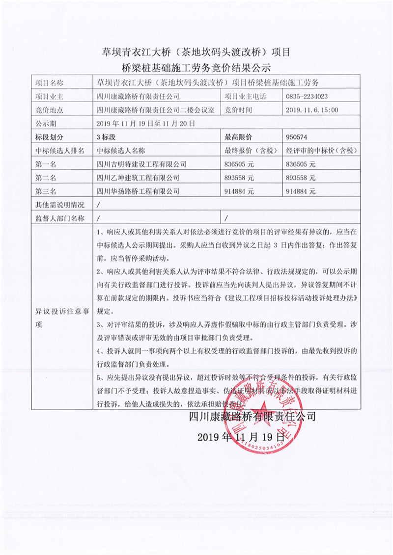 四川康藏路橋有限責(zé)任公司草壩青衣江大橋(茶地坎碼頭渡改橋)項(xiàng)目橋梁樁基礎(chǔ)施工勞務(wù)競價(3標(biāo)段)結(jié)果公示