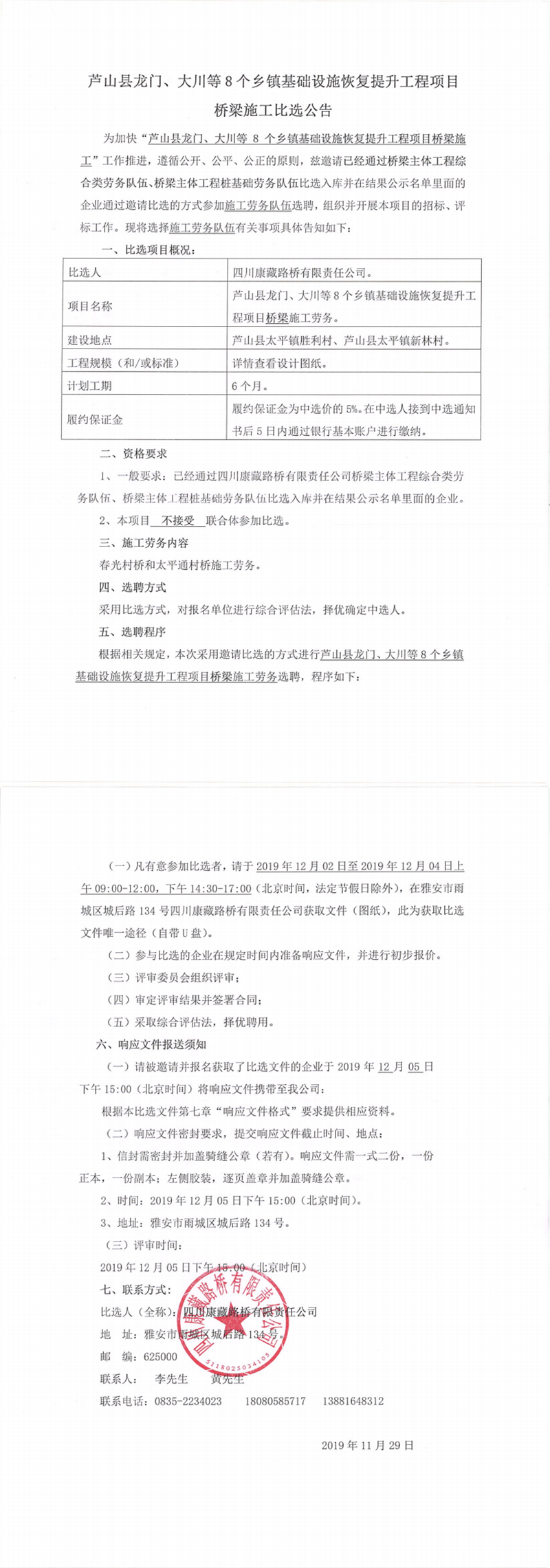 四川康藏路橋有限責(zé)任公司蘆山縣龍門、大川等8個鄉(xiāng)鎮(zhèn)基礎(chǔ)設(shè)施恢復(fù)提升工程項目橋梁施工比選公告