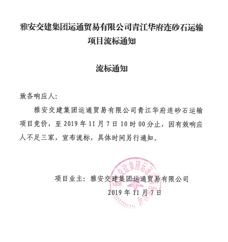 雅安交建集團運通貿易有限公司青江華府砂石運輸項目流標通知