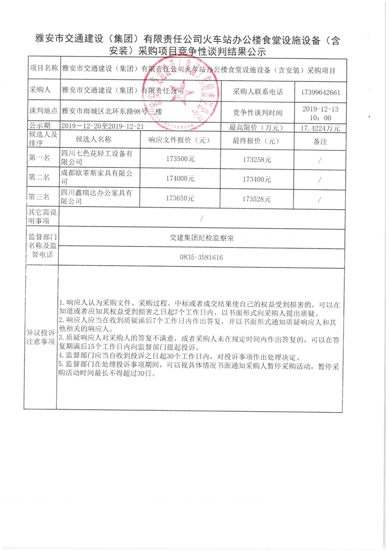 雅安市交通建設(shè)(集團(tuán))有限責(zé)任公司火車(chē)站辦公樓食堂設(shè)施設(shè)備(含安裝)采購(gòu)項(xiàng)目競(jìng)爭(zhēng)性談判結(jié)果公示
