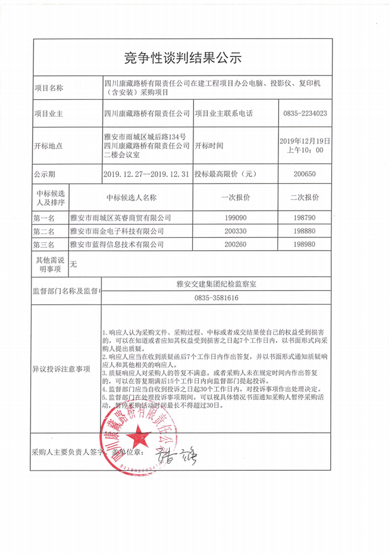 四川康藏路橋有限責任公司在建工程項目辦公電腦、投影儀、復印機(含安裝)采購項目競爭性談判結果公示