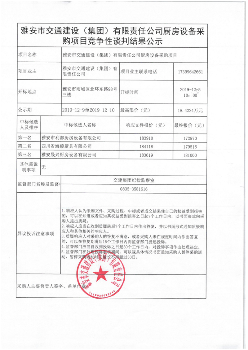 雅安市交通建設(shè)(集團(tuán))有限責(zé)任公司廚房設(shè)備采購項(xiàng)目競爭性談判結(jié)果公示