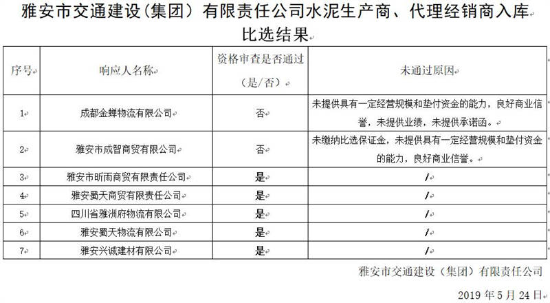 雅安市交通建設(shè)(集團)有限責(zé)任公司水泥生產(chǎn)商、代理經(jīng)銷商入庫比選結(jié)果公示