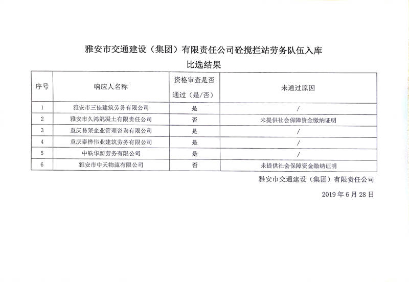 雅安市交通建設(集團)有限責任公司砼攪攔站勞務隊伍入庫比選結果