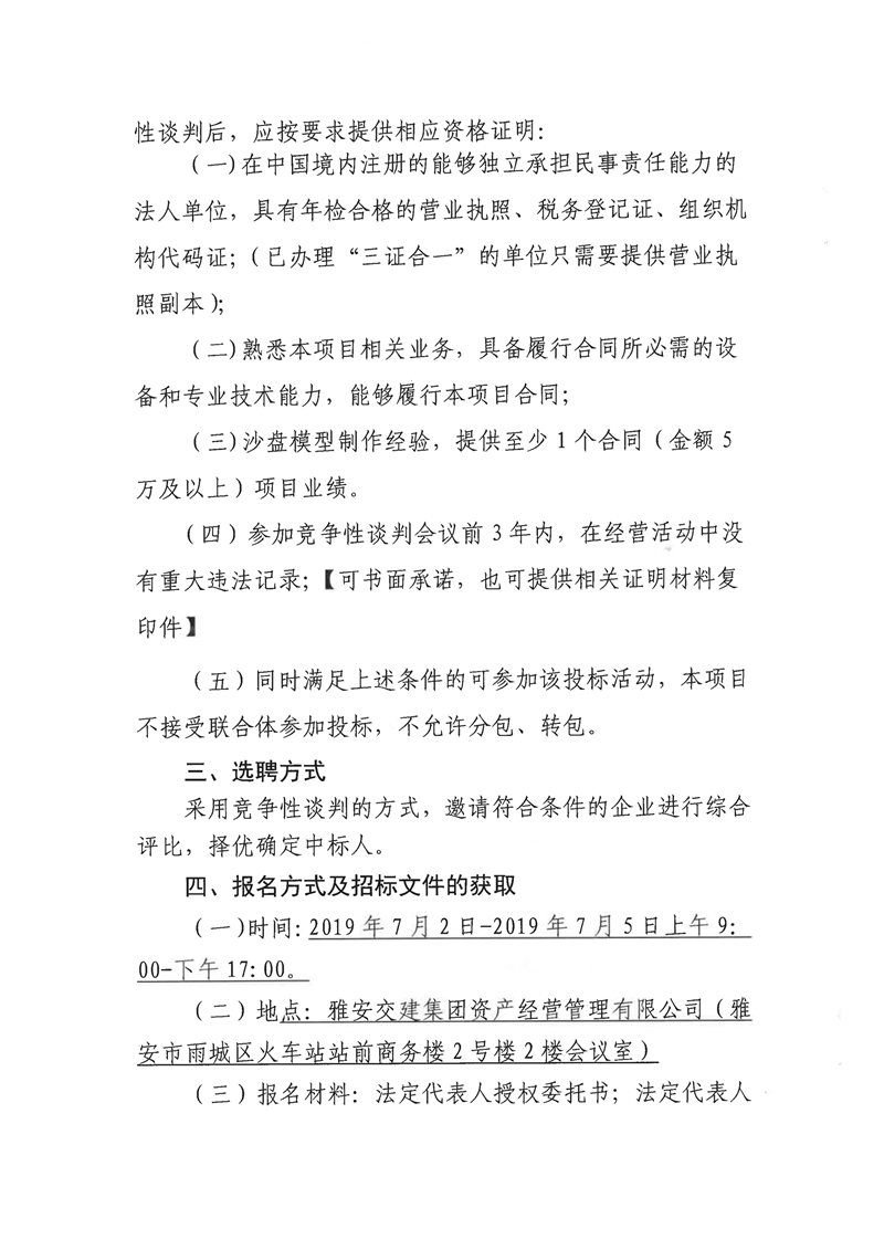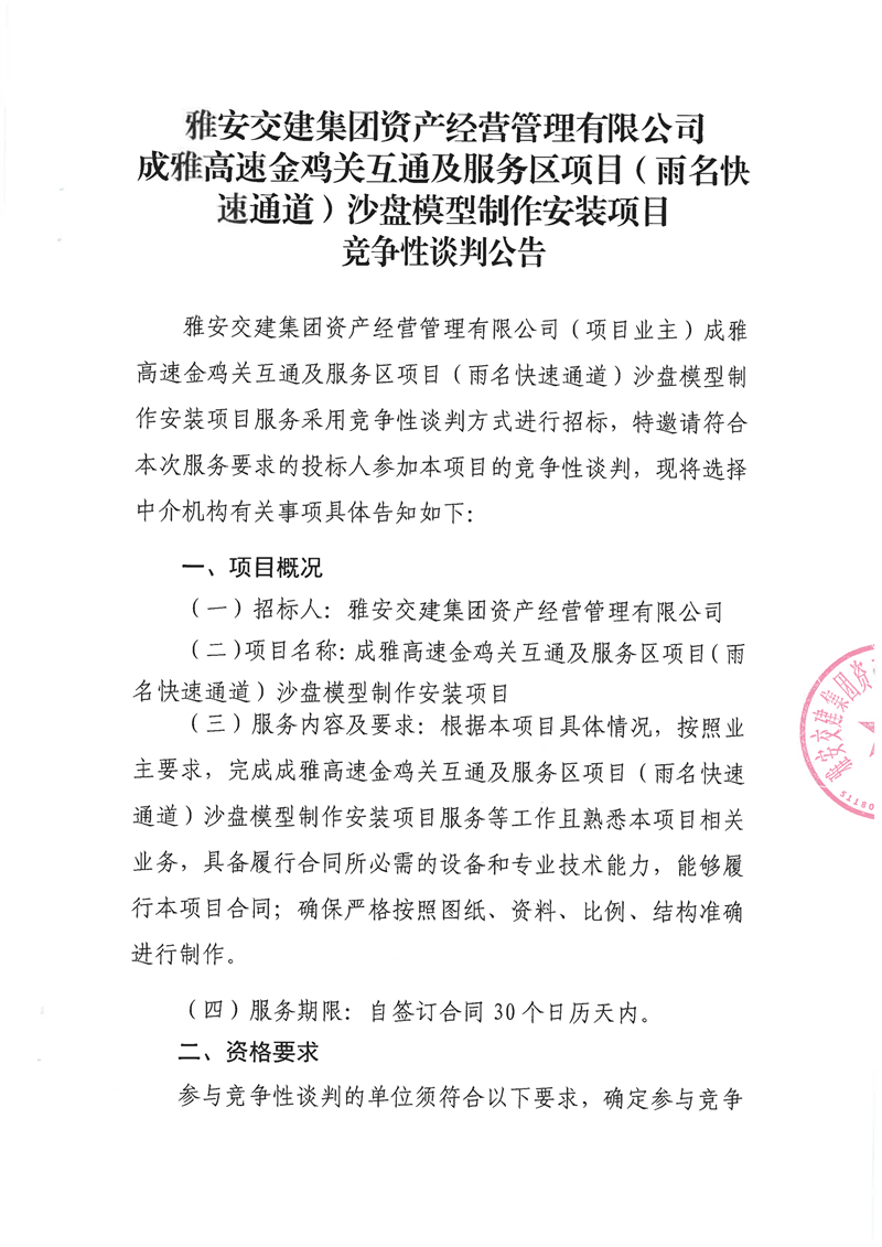 雅安交建集團資產(chǎn)經(jīng)營管理有限公司成雅高速金雞關互通及服務區(qū)項目(雨名快速通道)沙盤模型制作安裝項目競爭性談判公告