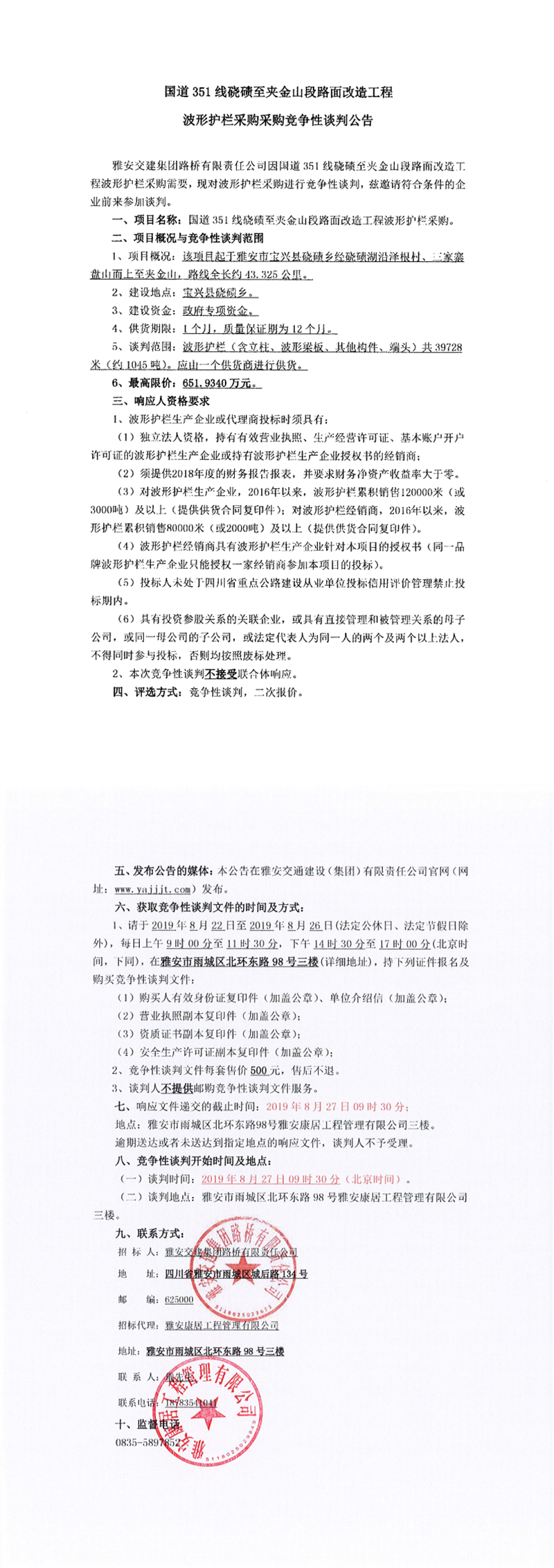 雅安交建集團路橋有限責(zé)任公司國道351線磽磧至夾金山段路面改造工程波形護欄采購項目競爭性談判公告