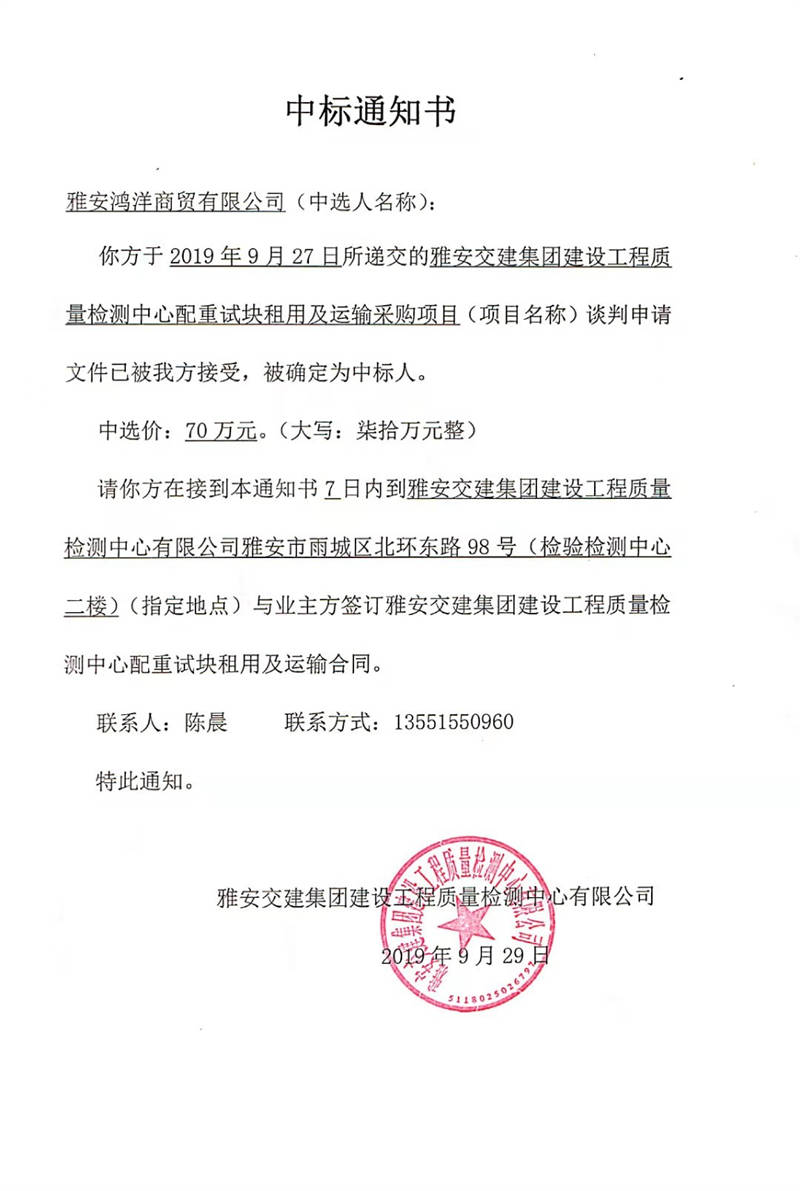 雅安交建集團建設工程質(zhì)量檢測中心配重試塊租用及運輸采購項目中標公示