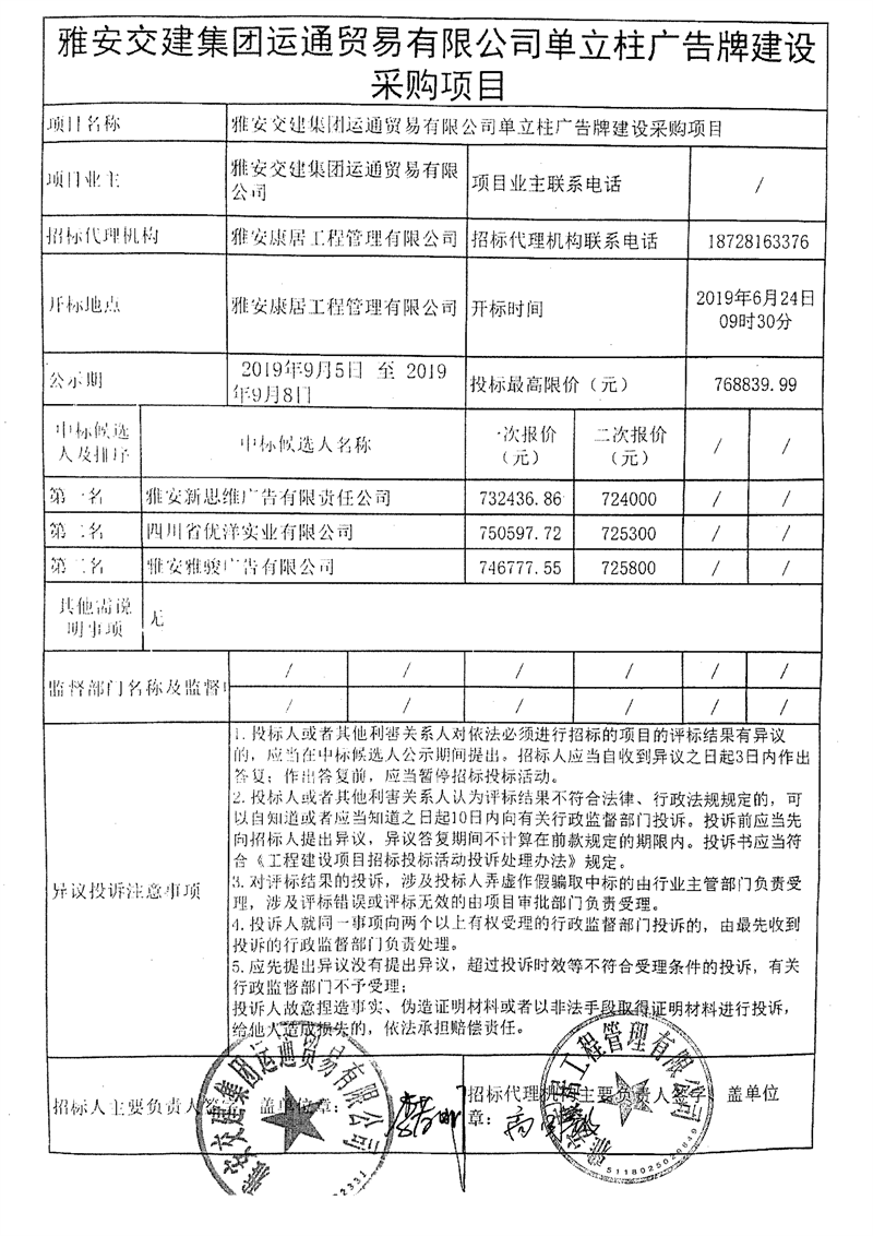 雅安交建集團運通貿(mào)易有限公司單立柱廣告牌建設采購項目競爭性談判結(jié)果公示