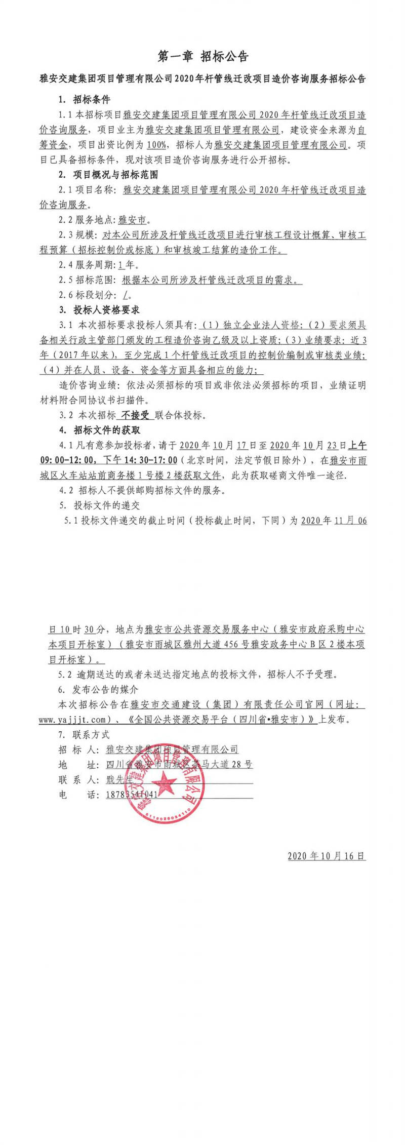 雅安交建集團(tuán)項(xiàng)目管理有限公司2020年桿管線遷改項(xiàng)目造價(jià)咨詢服務(wù)招標(biāo)公告