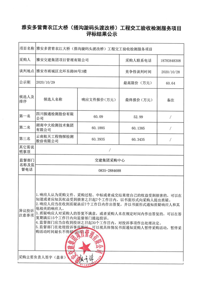 雅安交建集團(tuán)項目管理有限公司雅安多營青衣江大橋(搭溝漩碼頭渡改橋)工程交工驗收檢測服務(wù)項目評標(biāo)結(jié)果公示