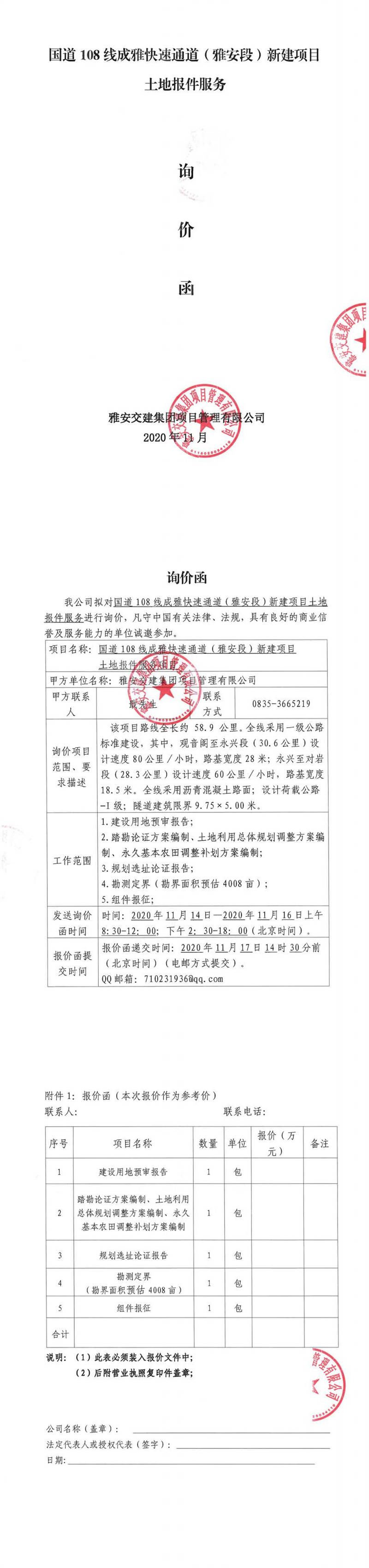 雅安交建集團(tuán)項(xiàng)目管理有限公司國道108線成雅快速通道(雅安段)新建項(xiàng)目土地報件服務(wù)項(xiàng)目詢價函