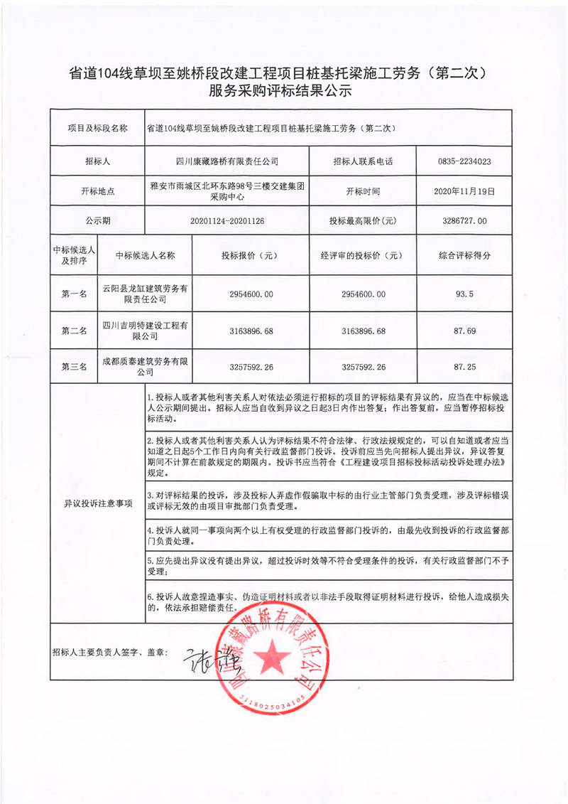 四川康藏路橋有限責(zé)任公司省道104線草壩至姚橋段改建工程項(xiàng)目樁基托梁施工勞務(wù)(第二次)服務(wù)采購評標(biāo)結(jié)果公示