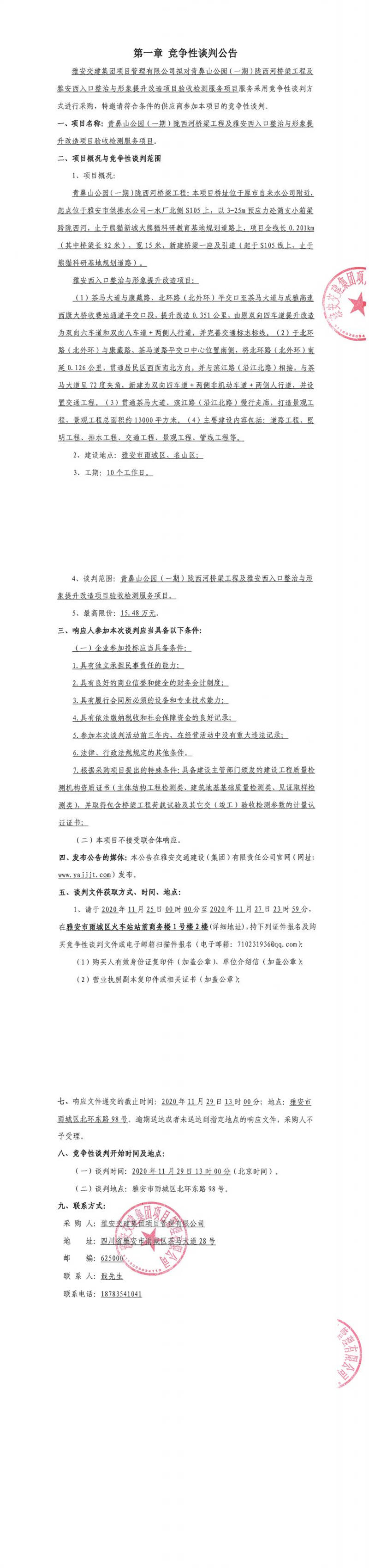 雅安交建集團項目管理有限公司青鼻山公園(一期)隴西河橋梁工程及雅安西入口整治與形象提升改造項目驗收檢測服務項目競爭性談判公告