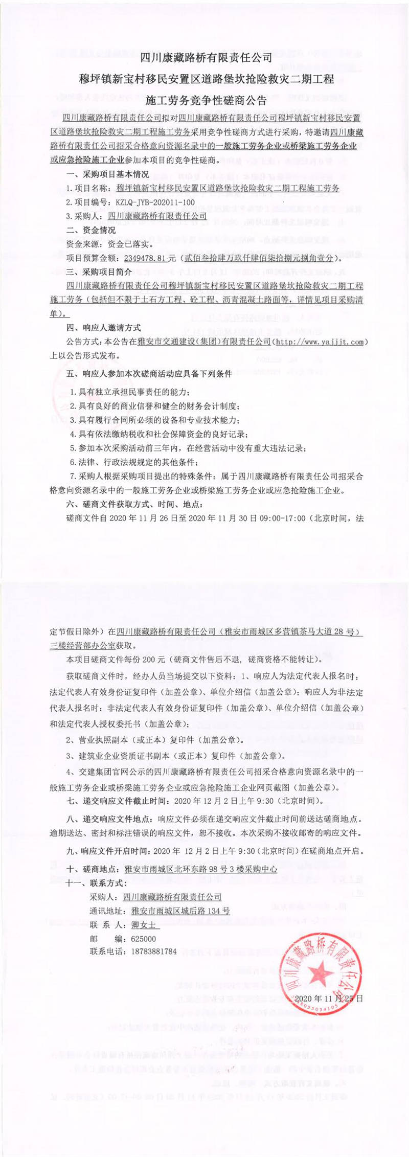 四川康藏路橋有限責(zé)任公司穆坪鎮(zhèn)新寶村移民安置區(qū)道路堡坎搶險(xiǎn)救災(zāi)二期工程施工勞務(wù)競(jìng)爭(zhēng)性磋商公告