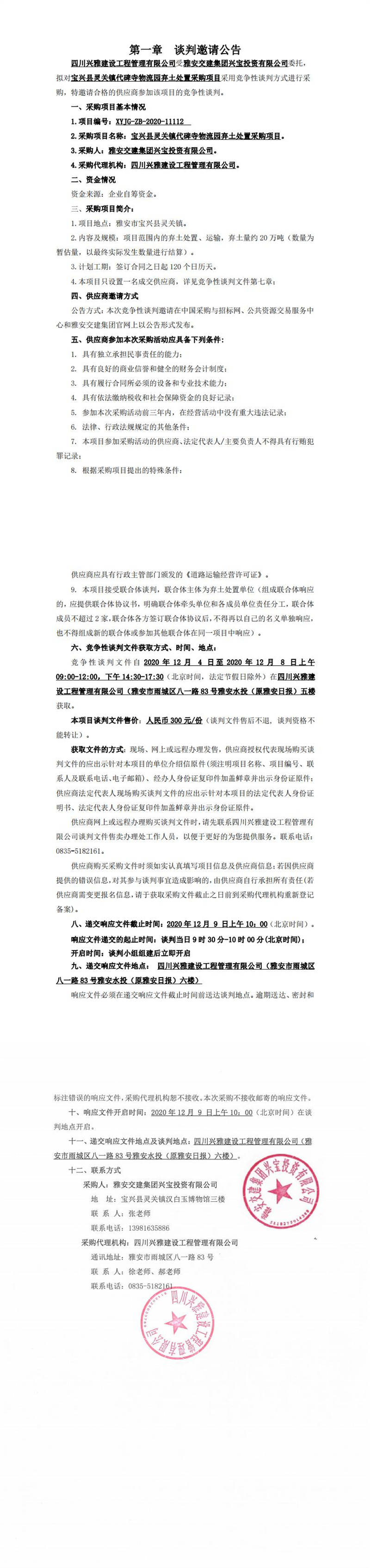 雅安交建集團興寶投資有限公司寶興縣靈關鎮(zhèn)代碑寺物流園棄土處置采購項目談判公告