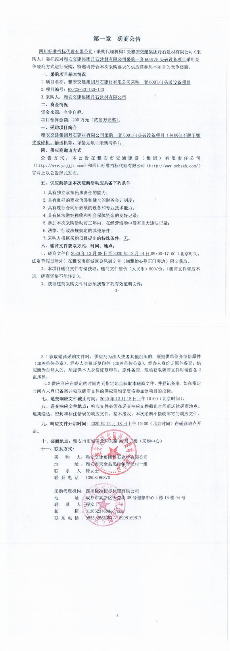 雅安交建集團丹石建材有限公司采購一套600T/H頭破設備項目磋商公告