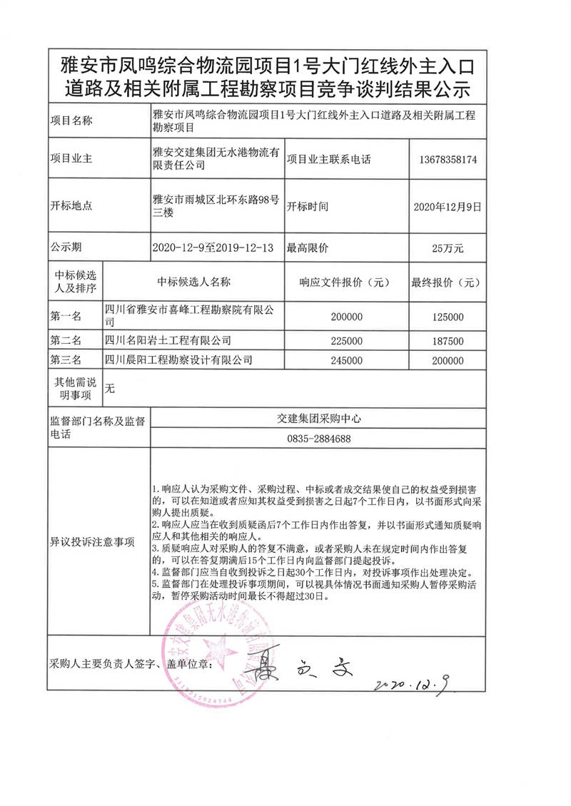 雅安交建集團(tuán)無(wú)水港物流有限責(zé)任公司雅安市鳳鳴綜合物流園項(xiàng)目1號(hào)大門(mén)紅線(xiàn)外主入口道路及相關(guān)附屬工程勘察項(xiàng)目競(jìng)爭(zhēng)談判結(jié)果公示