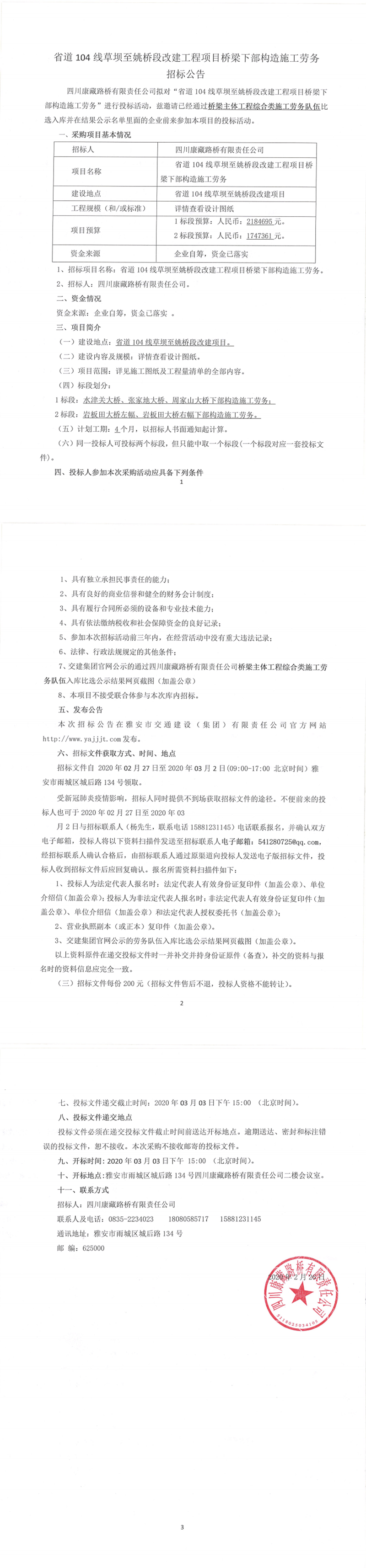 四川康藏路橋有限責(zé)任公司省道104線草壩至姚橋段改建工程項目橋梁下部構(gòu)造施工勞務(wù)招標(biāo)公告