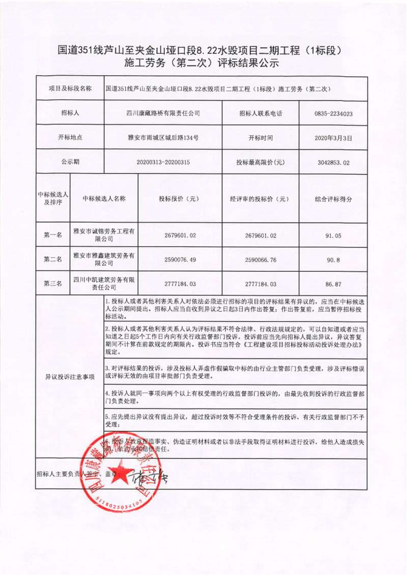 四川康藏路橋有限責(zé)任公司國道351線蘆山至夾金山埡口段8.22水毀項目二期工程(1標段)施工勞務(wù)(第二次)評標結(jié)果公示