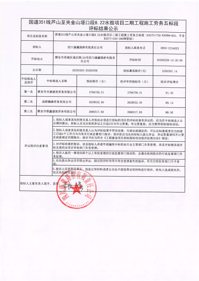 四川康藏路橋有限責任公司國道351線蘆山至夾金山埡口段8.22水毀項目二期工程施工勞務(wù)五標段評標結(jié)果公示