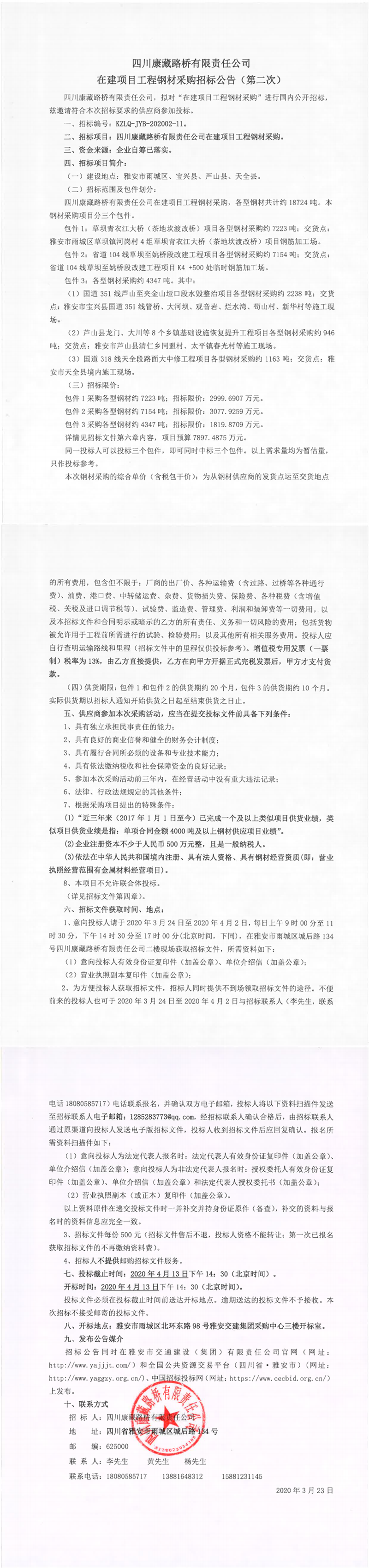 四川康藏路橋有限責任公司在建項目工程鋼材采購招標公告(第二次)