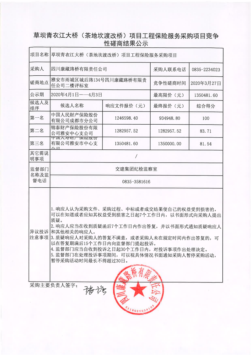 四川康藏路橋有限責(zé)任公司草壩青衣江大橋(茶地坎渡改橋)項(xiàng)目工程保險(xiǎn)服務(wù)采購項(xiàng)目競(jìng)爭(zhēng)性磋商結(jié)果公示