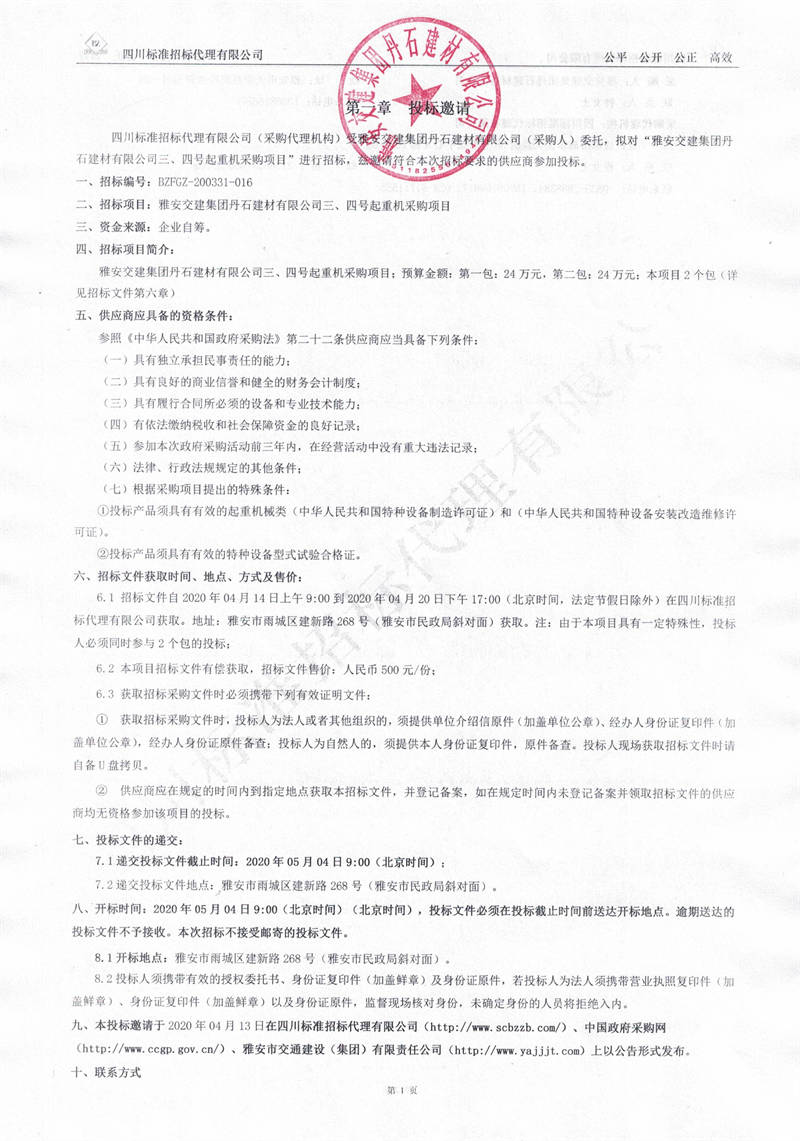 雅安交建集團(tuán)丹石建材有限公司三、四號起重機(jī)采購項目招標(biāo)公告