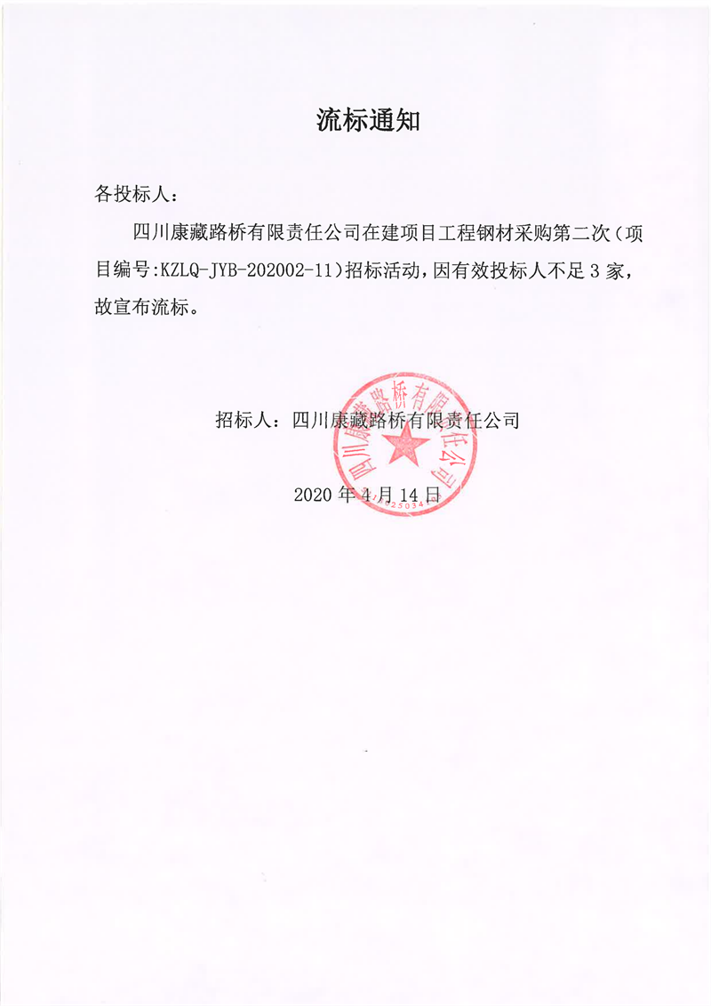 四川康藏路橋有限責(zé)任公司在建項(xiàng)目工程鋼材采購第二次流標(biāo)通知