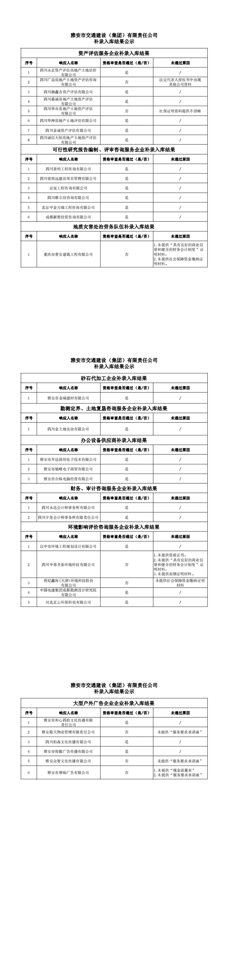 雅安市交通建設(shè)(集團(tuán))有限責(zé)任公司補(bǔ)錄入庫(kù)結(jié)果公示