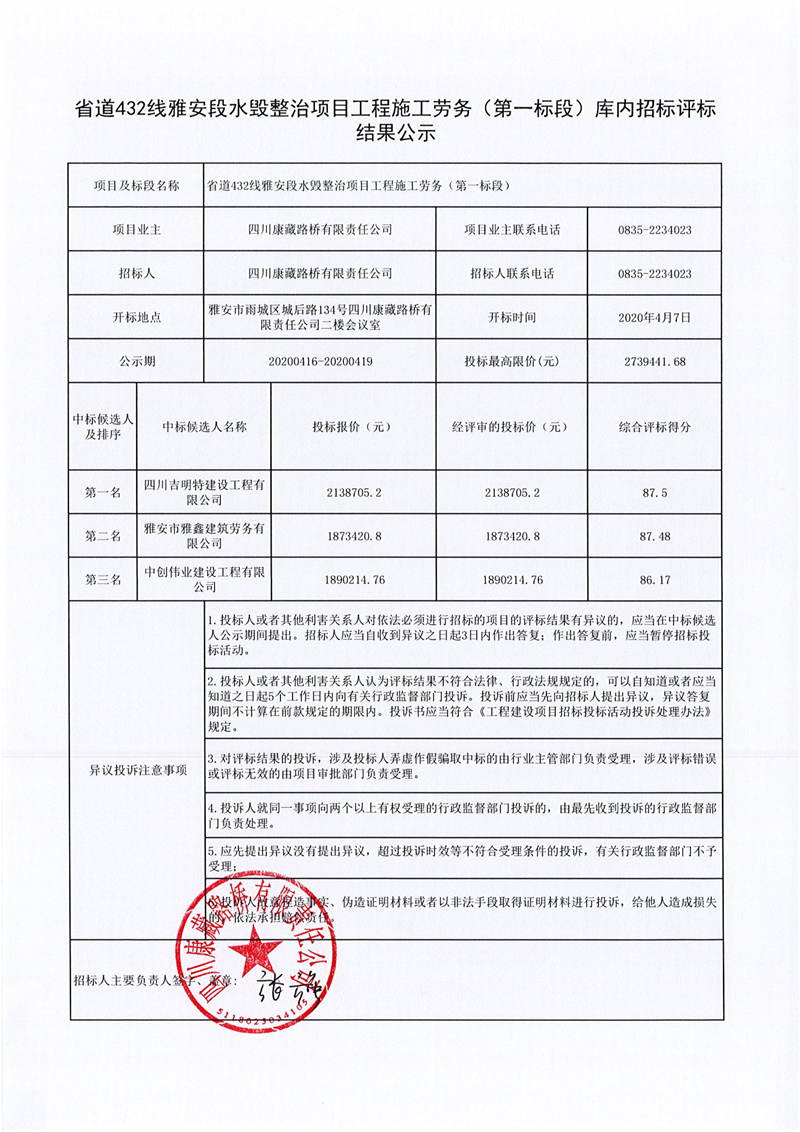 四川康藏路橋有限責任公司省道432線雅安段水毀整治項目工程施工勞務(wù)(第一標段)庫內(nèi)招標評標結(jié)果公示