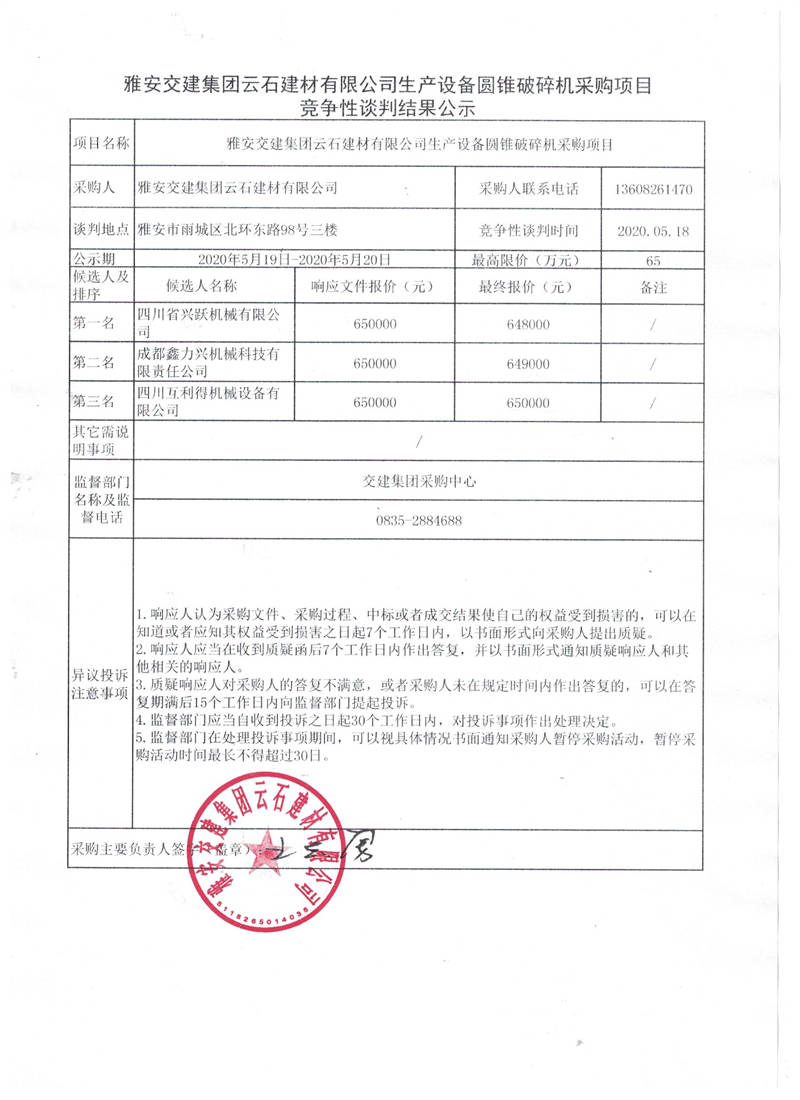 雅安交建集團云石建材有限公司生產設備圓錐破碎機采購項目競爭性談判結果公示