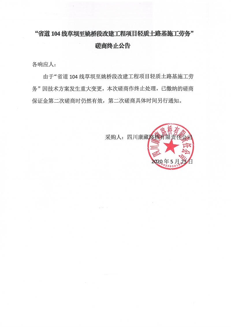 四川康藏路橋有限責(zé)任公司省道104線草壩至姚橋段改建工程項(xiàng)目輕質(zhì)土路基施工勞務(wù)磋商終止公告