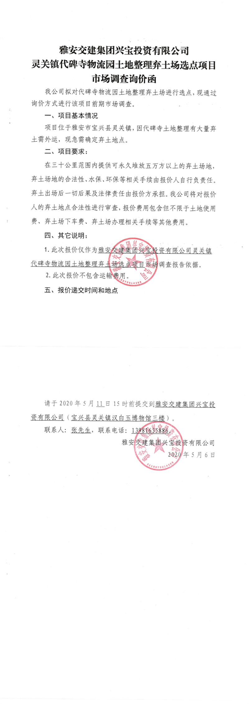 雅安交建集團(tuán)興寶投資有限公司靈關(guān)鎮(zhèn)代碑寺物流園土地整理?xiàng)壨翀?chǎng)選點(diǎn)項(xiàng)目市場(chǎng)調(diào)查詢價(jià)函