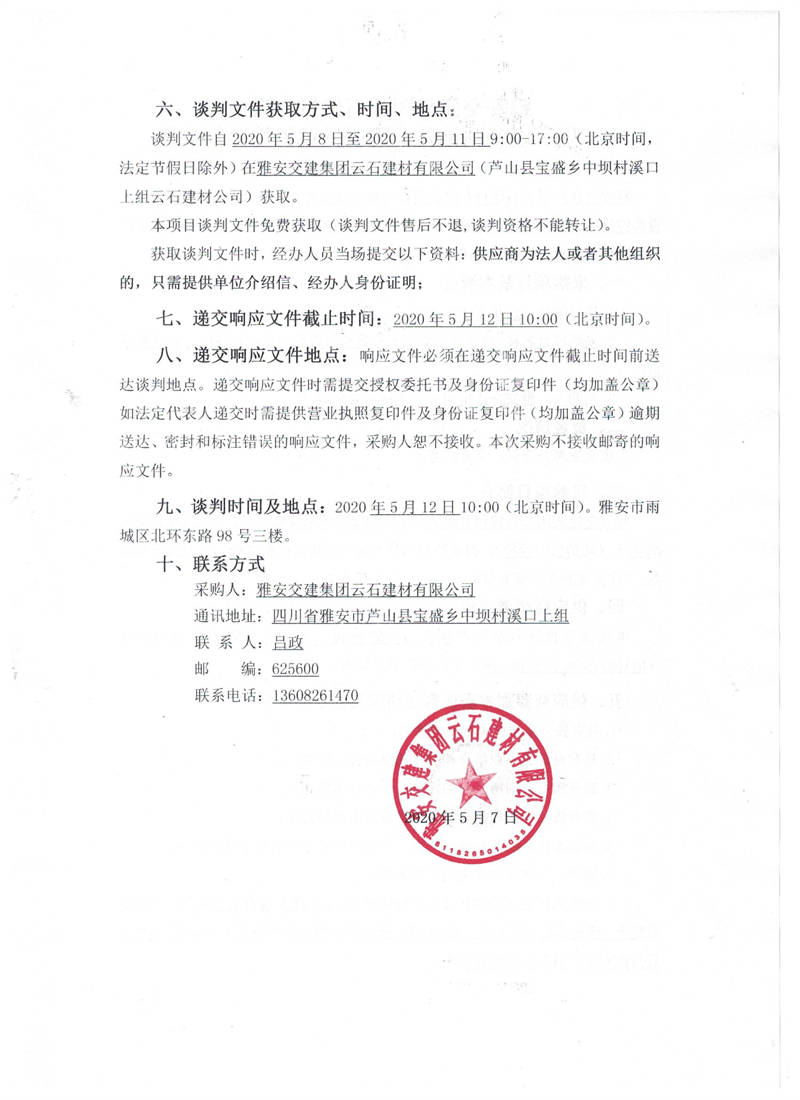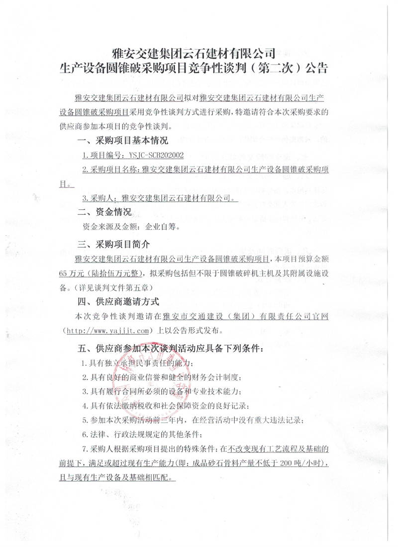 雅安交建集團云石建材有限公司生產(chǎn)設(shè)備圓錐破采購項目競爭性談判(第二次)公告
