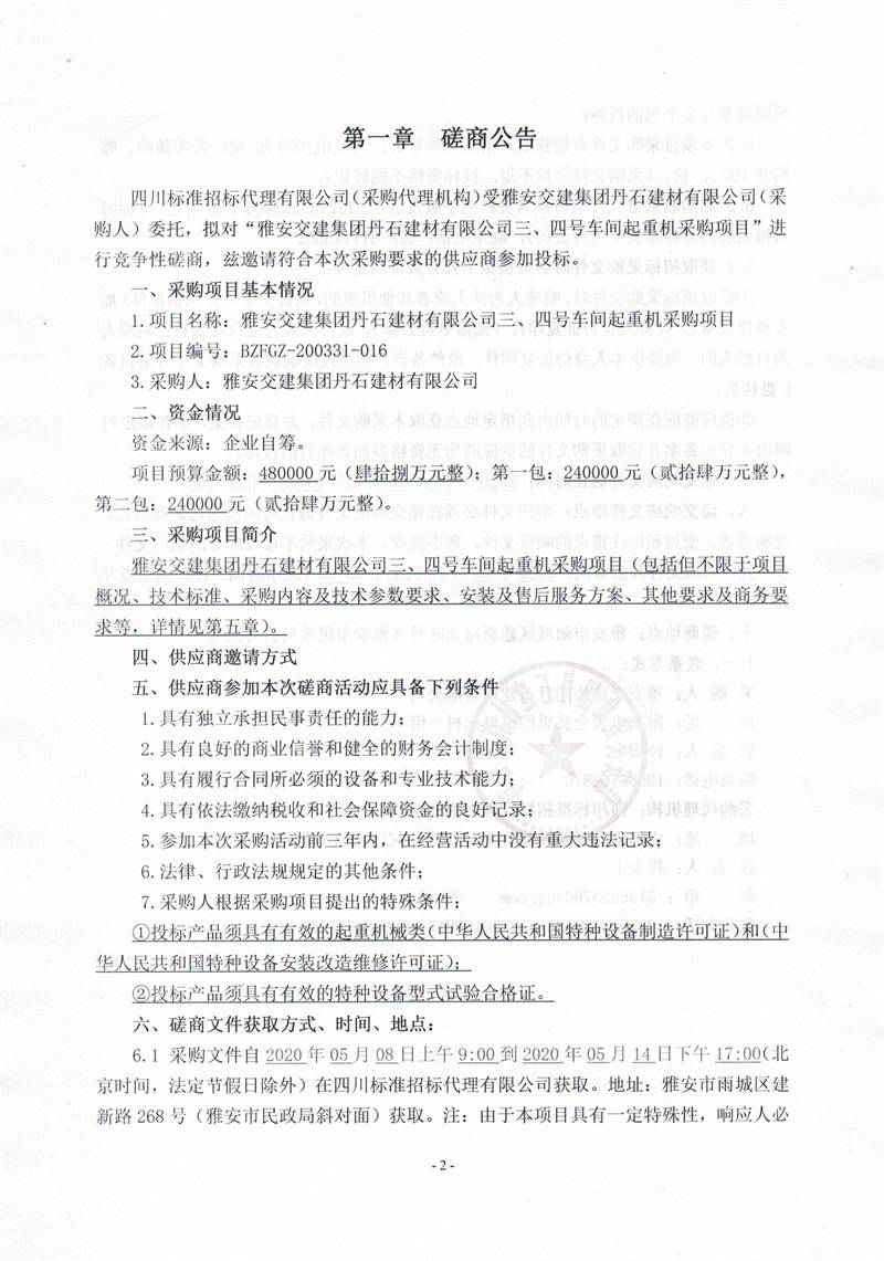 雅安交建集團(tuán)丹石建材有限公司三、四號(hào)車間起重機(jī)采購項(xiàng)目競(jìng)爭(zhēng)性磋商公告
