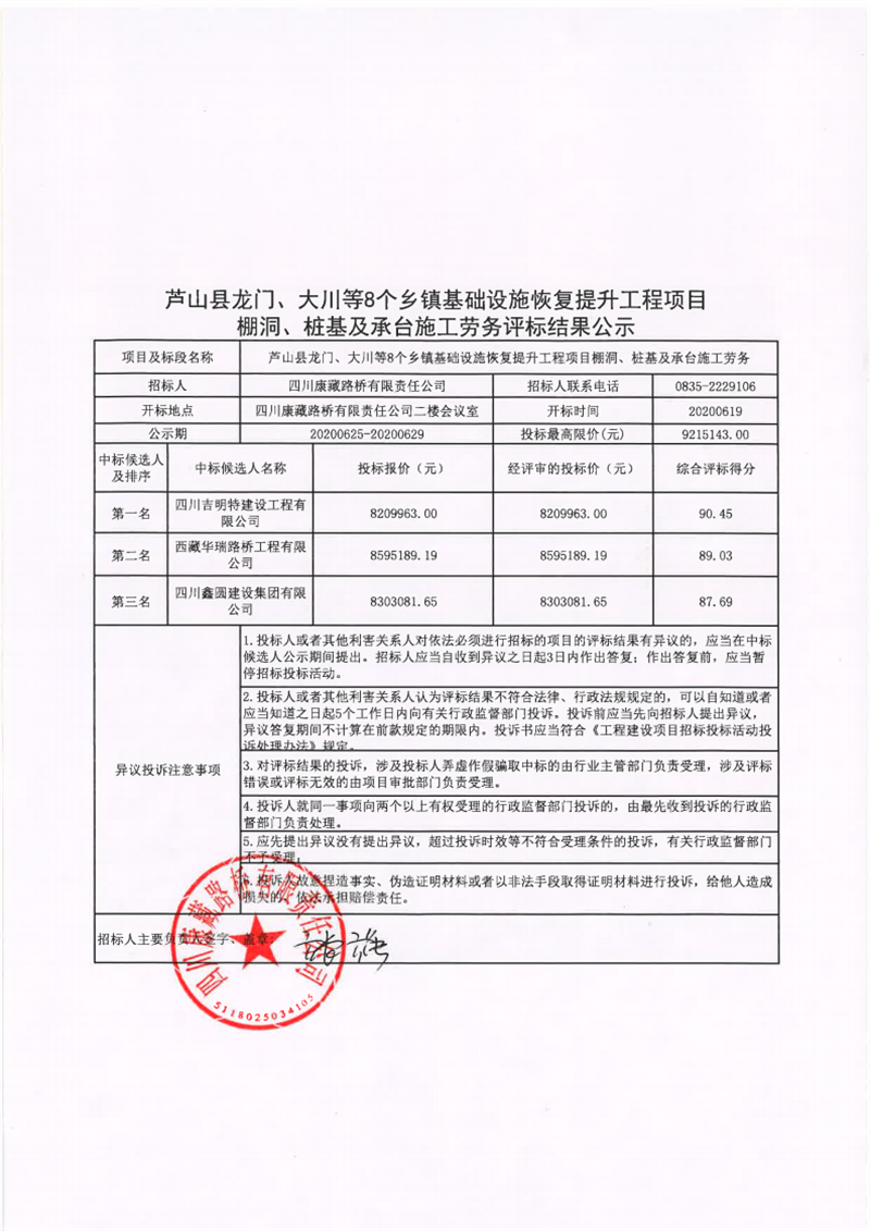 四川康藏路橋有限責(zé)任公司蘆山縣龍門、大川等8個鄉(xiāng)鎮(zhèn)基礎(chǔ)設(shè)施恢復(fù)提升工程項(xiàng)目棚洞、樁基及承臺施工勞務(wù)評標(biāo)結(jié)果公示