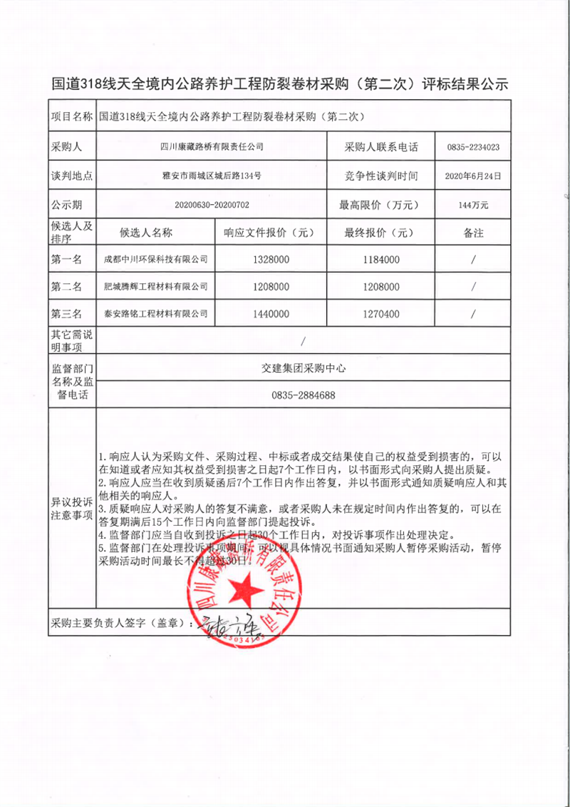 四川康藏路橋有限責(zé)任公司國(guó)道318線天全境內(nèi)公路養(yǎng)護(hù)工程防裂卷材采購(gòu)(第二次)評(píng)標(biāo)結(jié)果公示