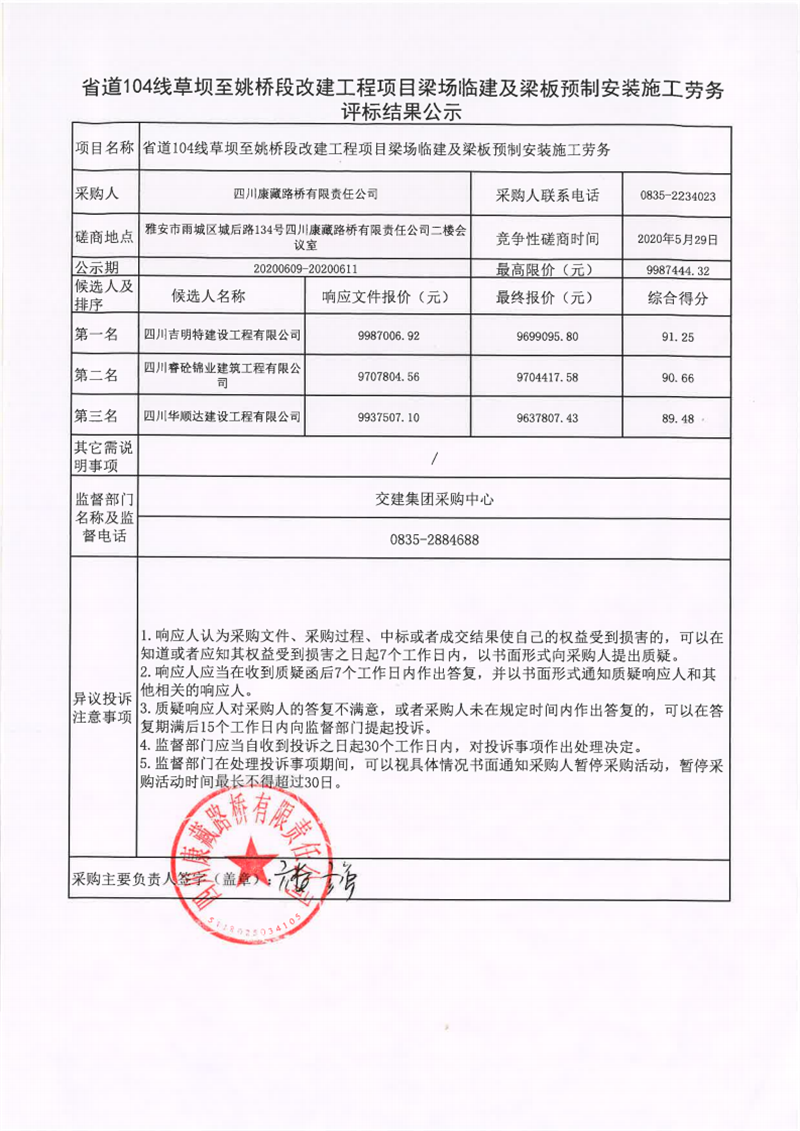 四川康藏路橋有限責(zé)任公司省道104線草壩至姚橋段改建工程項(xiàng)目梁場臨建及梁板預(yù)制安裝施工勞務(wù)評標(biāo)結(jié)果公示