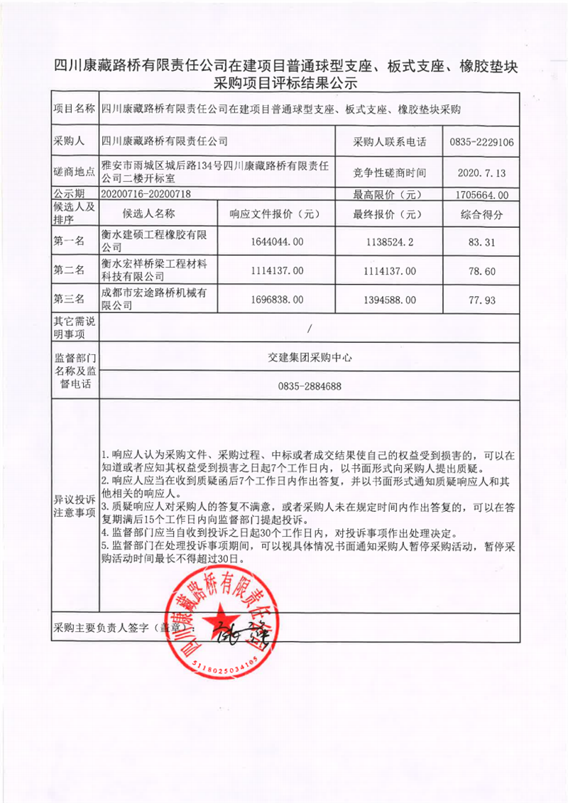 四川康藏路橋有限責(zé)任公司在建項目普通球型支座、板式支座、橡膠墊塊采購項目評標(biāo)結(jié)果公示