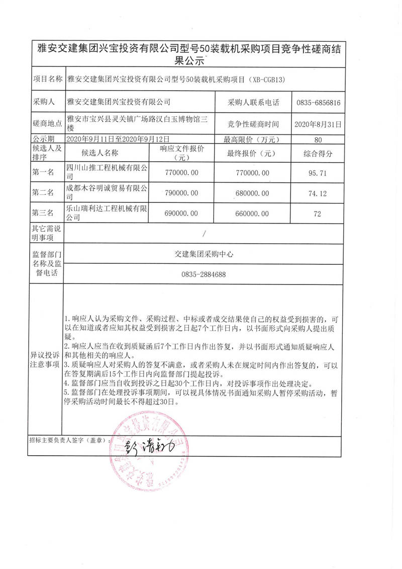 雅安交建集團(tuán)興寶投資有限公司型號50裝載機(jī)采購項(xiàng)目競爭性磋商結(jié)果公示