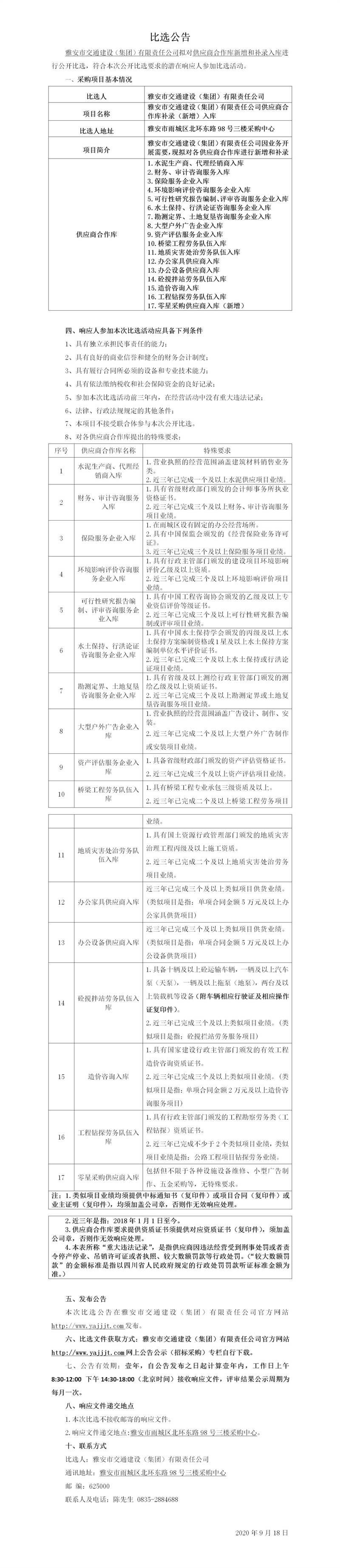 雅安市交通建設(集團)有限責任公司供應商合作庫補錄(新增)入庫比選公告