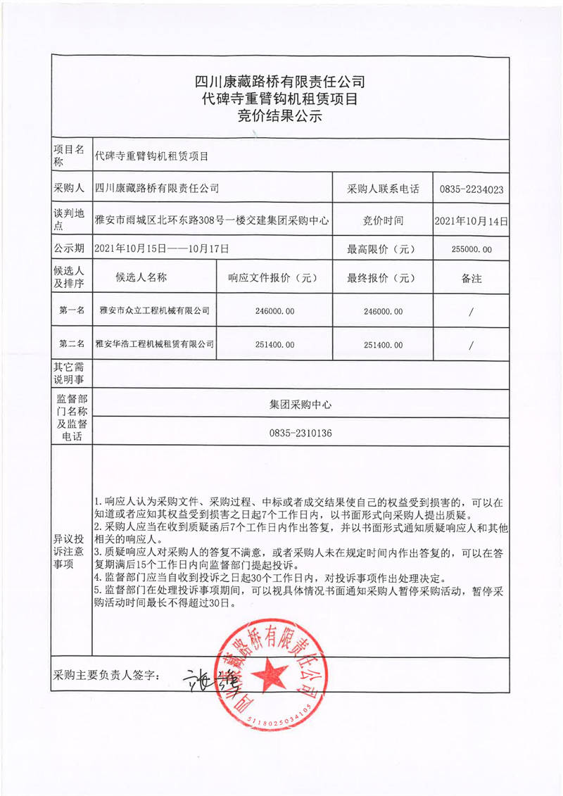 四川康藏路橋有限責(zé)任公司代碑寺重臂鉤機(jī)租賃項(xiàng)目競價(jià)結(jié)果公示